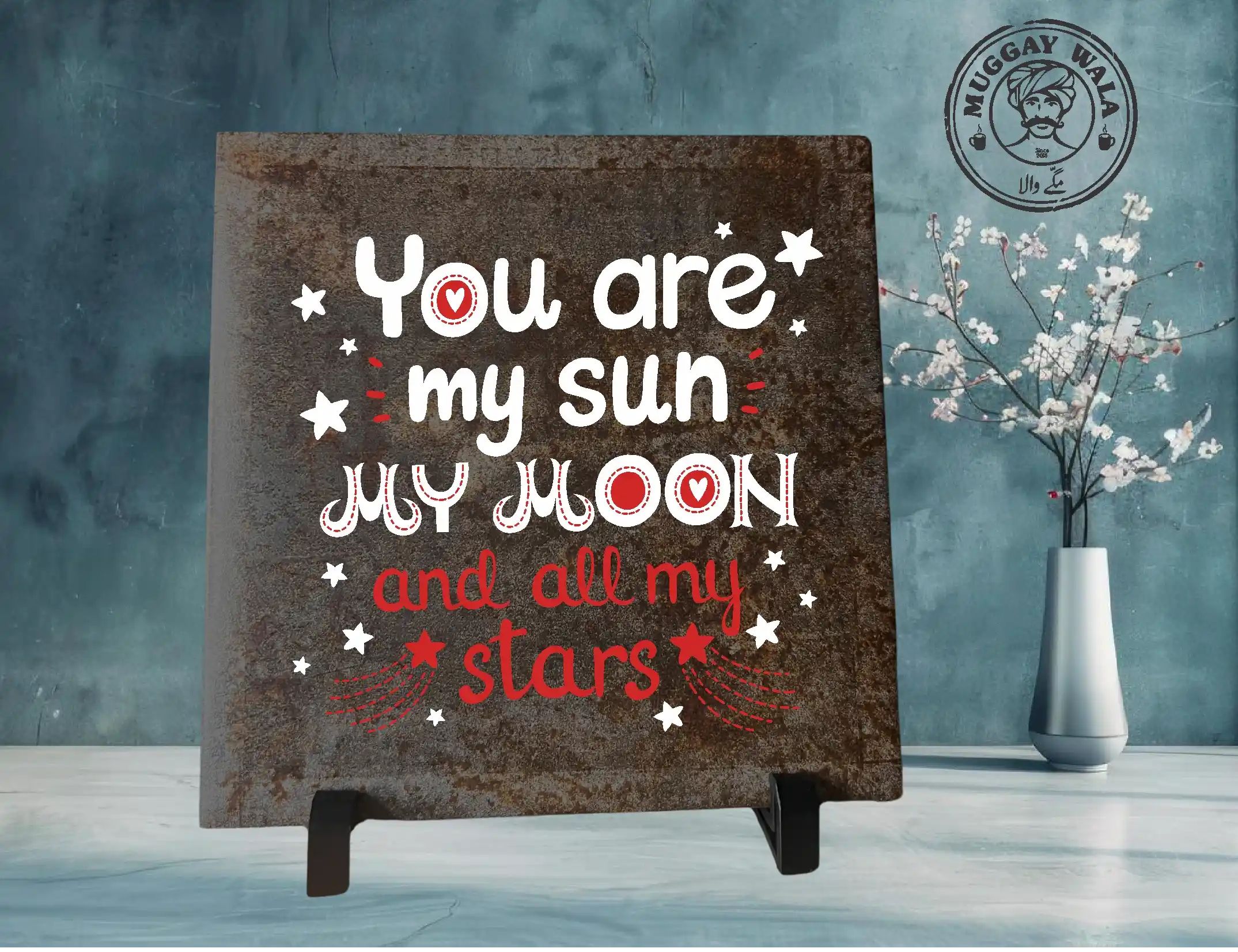 Celebrate eternal love with these sleek black ceramic tiles featuring the heartfelt “Sun My Moon” design. Perfect for adding a bold and romantic touch to any space.
